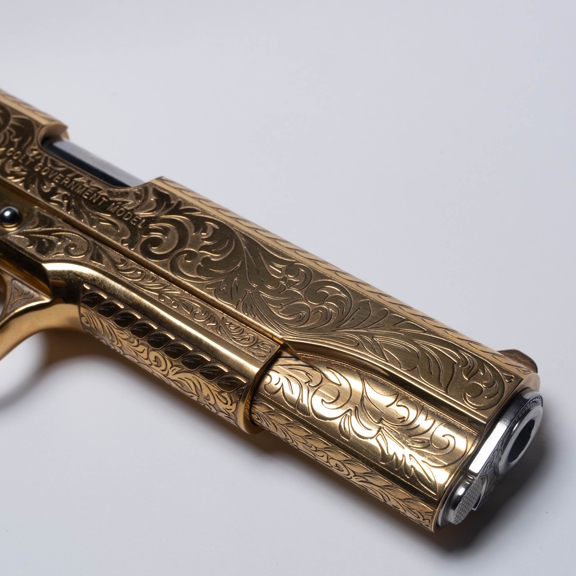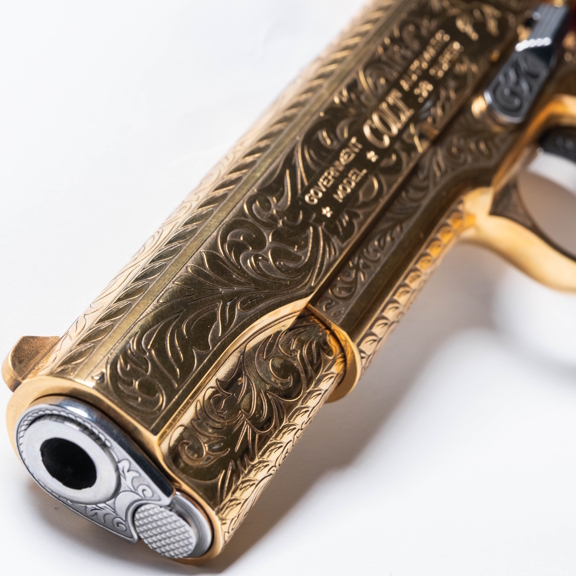 A timeless classic reimagined. This Colt Government Model 1911, chambered in .38 Super, has been expertly engraved and finished by Stormbreaker Laser Engraving with a refined, traditional scroll motif that wraps the slide, frame, and controls. The result is an elegant, museum-quality showpiece that balances heritage styling with modern luxury.